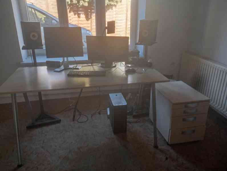 * Pracovní stůl: Velká, světlá deska (typ IKEA Galant/Bekant) s nastavitelnými kovovými nohami. Velmi stabilní, nabízí dostatek prostoru pro dva monitory.