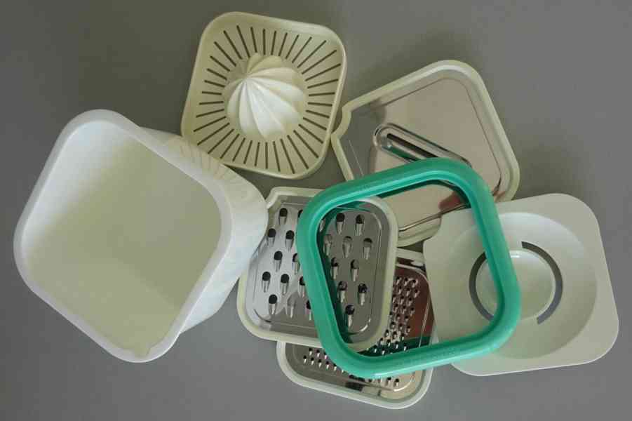 Plně funkční a velice zachovalý ruční odšťavňovač (lis na citrusy) se struhadly a nádobou. Patentované kompaktní a multifunkční provedení = snadno nasadíte nástavec pro odšťavňování, strouhání atd. na nádobu a po očištění všechy nástavce opět snadno složíte do nádoby. Materiál nerez a velmi kvalitní plast = všechny součásti jsou kompatibilní s myčkou. Cena 99 Kč.