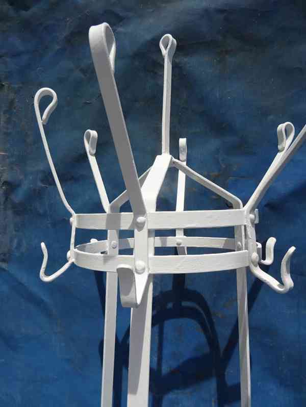 Prodám stabilní kovový věšák na klobouky , čepice , kabáty a deštníky , ve funkcionalistickém stylu , zhotovený z ohýbané ocelové nýtované pásovice , ve velice zachovalém funkčním stavu , stáří ca 100 let . Cena dohodou , nebo nabídněte .