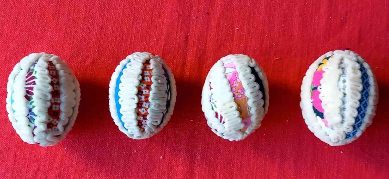 Prodám 4 slepičí velikonoční kraslice zdobené olepováním družinou, velikost 6÷7 cm (200 Kč) a 4 ks slepičí velikonoční kraslice zdobené olepováním textilií, velikost 6÷7 cm (180 Kč).