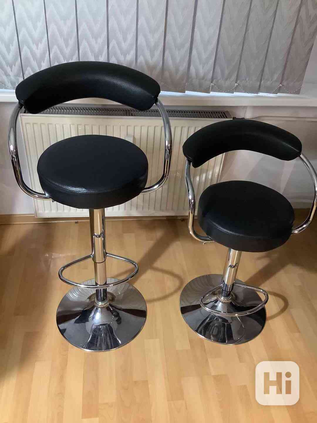 Dvě barové židle v moderním designu. Černá koženka, pohodlné opěrky, chromovaná konstrukce, výškově nastavitelné pomocí páčky, otočné sedadlo
