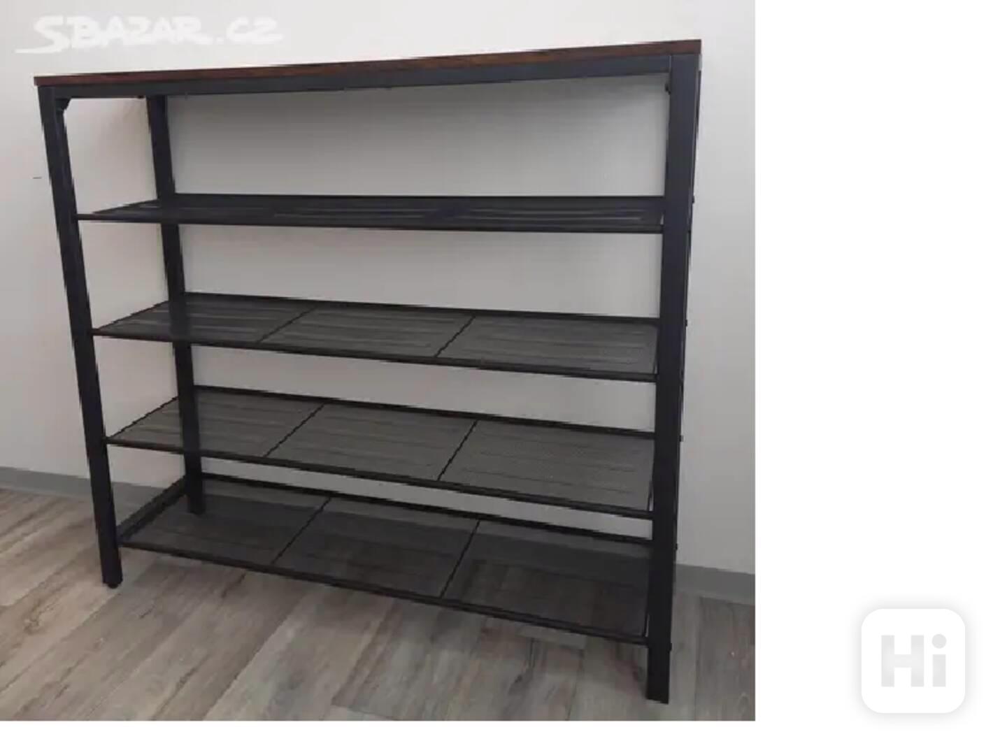 Moderní kovový botník s rustikální dřevěnou deskou a čtyřmi vzdušnými mřížovými patry pro praktické uložení až 20 párů bot. Rozměry: 100 × 30 × 92,5 cm. Ideální do předsíně nebo chodby. Robustní kovová konstrukce zajišťuje stabilitu, elegantní vzhled se hodí do moderního i industriálního interiéru.