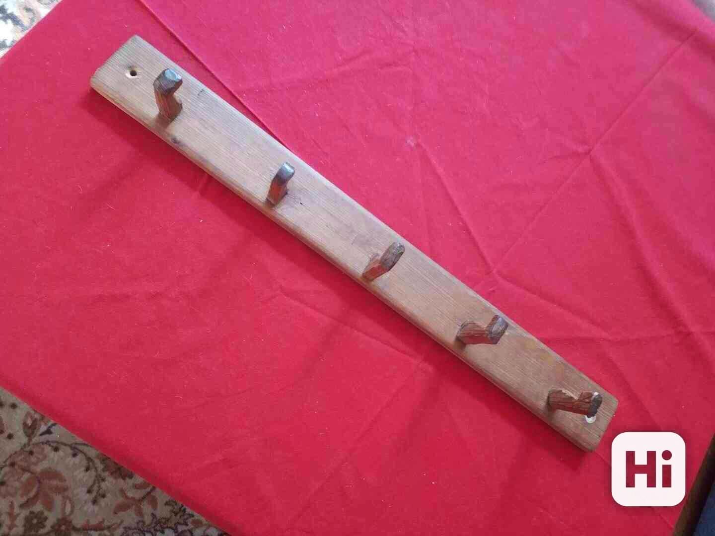 retro celodřevěný věšák (délka 59 cm) - cena Kč 49,-, dvouramenný šušák na ručníky (délka 45 cm) - cena Kč 49,-, dřevěný panel pod kuchyňskou linku (délka 120 cm) - cena Kč 49,-, proutěný tác (rozměry 63x36 cm) - cena 49,-, prostírání - ruční práce - (rozměry průměr 2x48 a 23 cm) - cena za všechny tři Kč 49,-