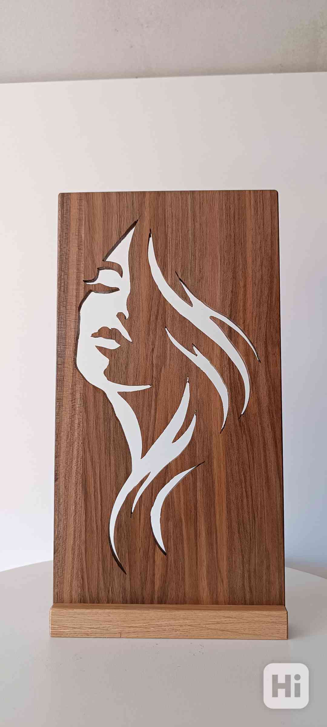 Umělecké dekorace ze masivního dřeva. Materiál ořech, podstavec dub. Rozměry: výška 340 mm , šířka 175mm , tloušťka 10 mm. Nátěr eko lak