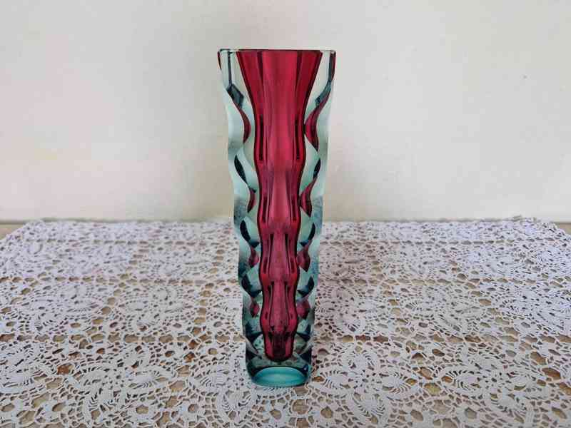 Broušená Váza Oldřich Lipský, zajímavá barva, berylová s červeno-rudou - Exbor, 60 léta, 20 stol.