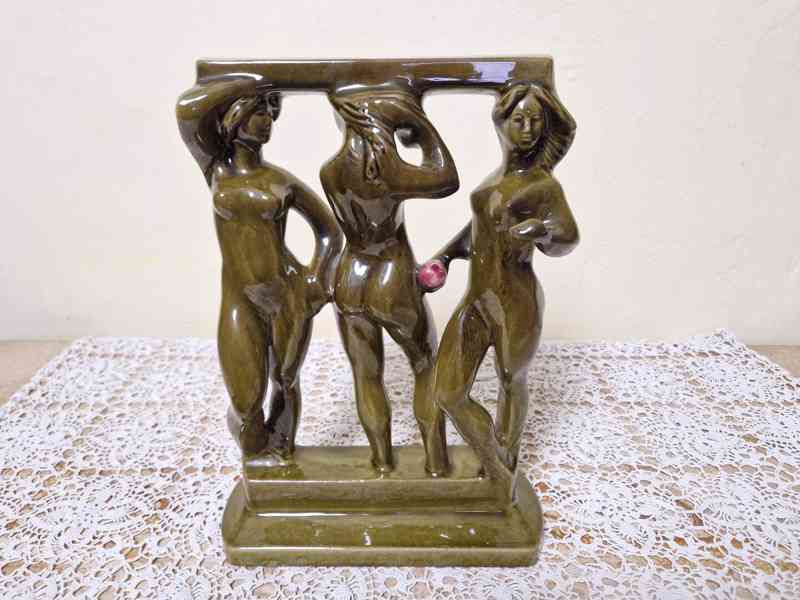 Málo vídaná větší stylová keramická plastika, Tři Grácie, Paridův soud - Jihokera Czechoslovakia, 80 léta 20 stol, značeno etiketou a číslem.