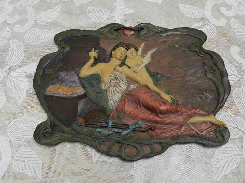 Krásný secesní reliéf, malovaná a lakovaná keramika, velmi kvalitní zpracování - značeno, Ernst Wahllis, Wien Austria, kolem 1900.