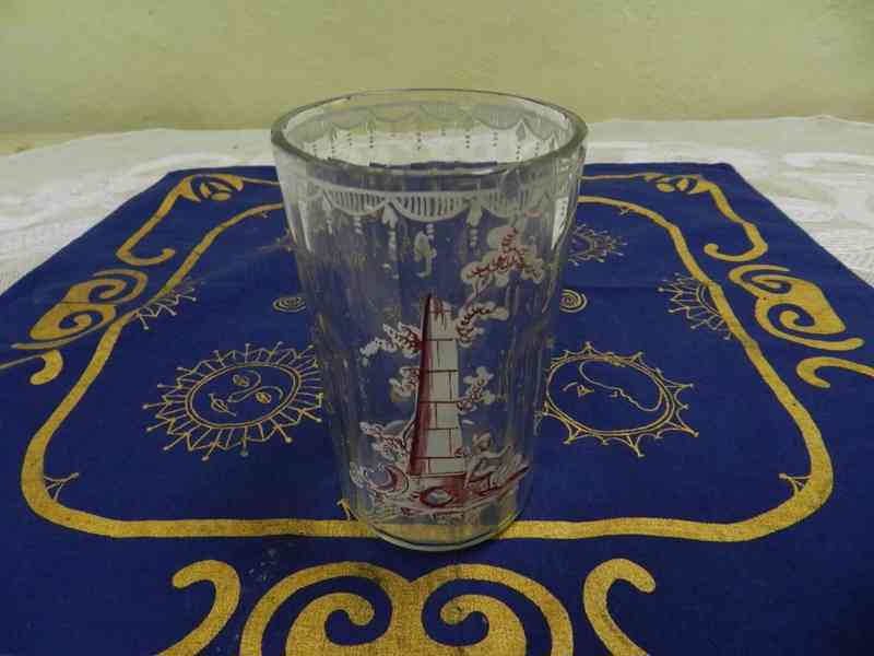 Krásná barokní Sklenice, čiré sklo, malba na skle, válcovitý tvar - Čechy, 18 stol.