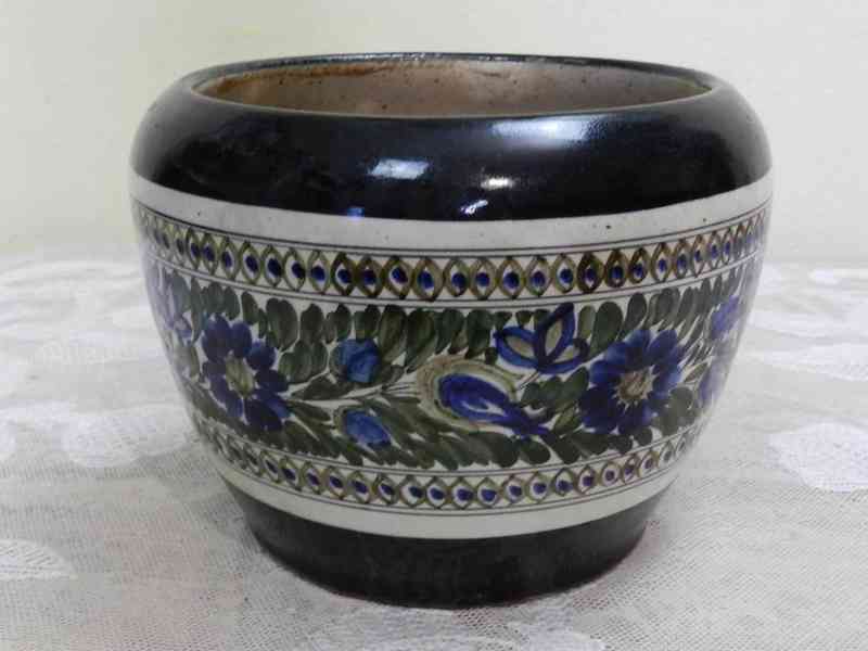 Hezký starý malovaný keramický Květináč, barva černá, modrá, zelená, 1 pol. 20 stol.