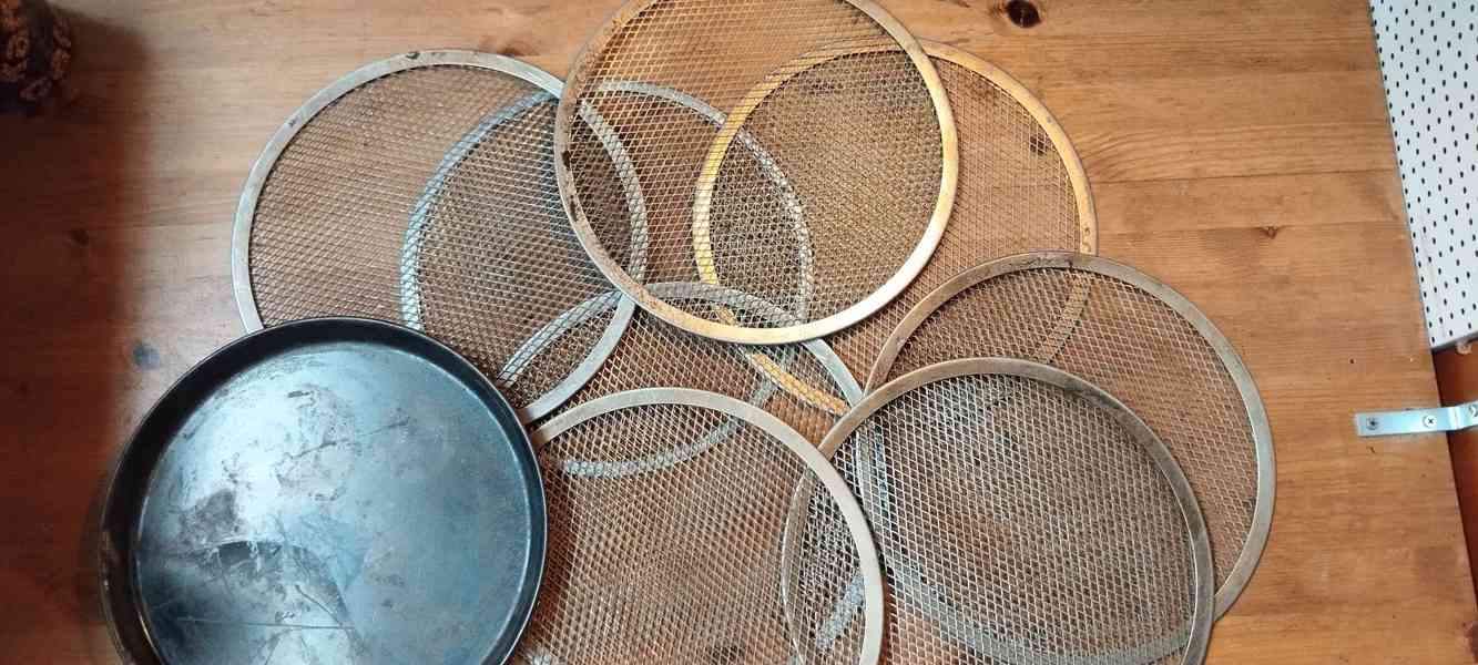 Síta a plech na pizzu, použité z malé pizzerie; pizza síta hliníková s průměrem 33 cm v počtu 8 ks a plech na pizzu v průměru 33 cm v počtu 1 ks. Běžná cena: 150 Kč / kus, bazarová cena: 75,- Kč / kus + doprava. (kód: 300623-10)