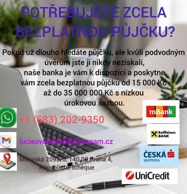 Pro vaše krátkodobé, střednědobé a dlouhodobé potřeby v oblasti půjček a financování. Máte veřejný nebo soukromý projekt a chybí vám finanční prostředky? Máte nedostatek hotovosti? Nebojte se. Řešení je konečně tady. Nabízíme půjčky, které přinesou radost a štěstí do vašeho života a vaší rodiny. Naše bankovní instituce nabízí všechny typy půjček bez ohledu na pohlaví nebo rasu a bez poplatků a záruk. Možná vaši žádost zamítlo několik bank; nabízíme naše místní služby, které vám pomohou dosáhnout vašich cílů. Naše nabídky půjček se pohybují od 85 000 Kč do 2 000 000 Kč s roční úrokovou sazbou 3 % a dobou splácení od 1 do 25 let. Žádosti zpracováváme do 48 hodin, abychom zajistili, že finanční prostředky budou připsány na váš bankovní účet. Důvěřujte nám a nebudete zklamáni.