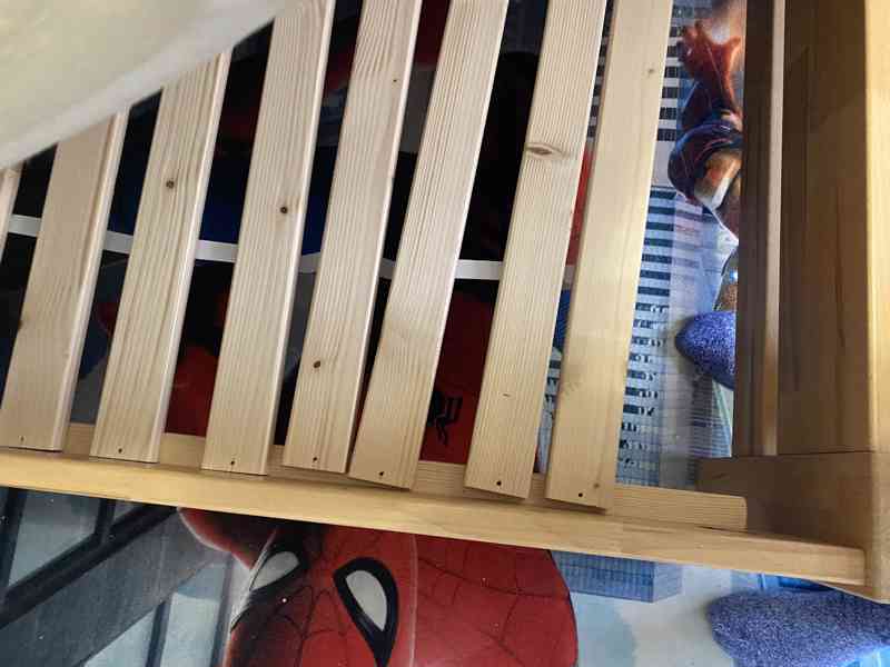 Postel , Dub dřevo super stav, matrace 18cm, dřevěný rošt v ceně, středně tvrdá matrace, téměř se na ni nespalo.