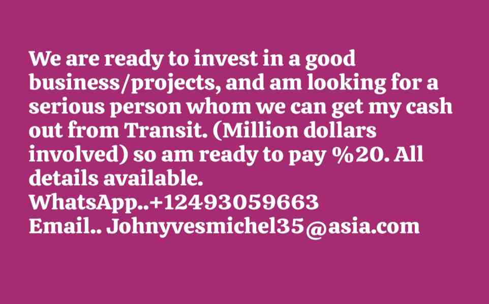 Jsme připraveni investovat do dobrého podnikání/projektů a hledáme seriózního člověka, od kterého bychom mohli dostat peníze z Transitu. (Jde o miliony), takže jsem připraven zaplatit 20 %. Veškeré podrobnosti k dispozici.