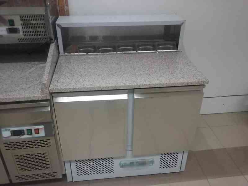 Chladící pizza stůl s granitovou pracovní plochou. Modelová řada EKO, stůl dvoudveřový nerezový, chlazení dole, chladící prostor pro 5 x 1/6 GN, cirkulační chlazení, digitální ovládání. Teplota +5°C až +8°C; obsah 256 litrů; výkon 0,34 kW / 230 V; rozměr ŠxHxV: 900 x 700 x 1075 mm. Cena: 28.490,- Kč vč. DPH + doprava. (kód: S833027)