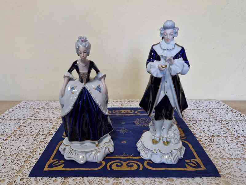 Luxusní párové sošky v kobaltu, Dáma a Kavalír - Royal Dux, 2 po. 20 stol.