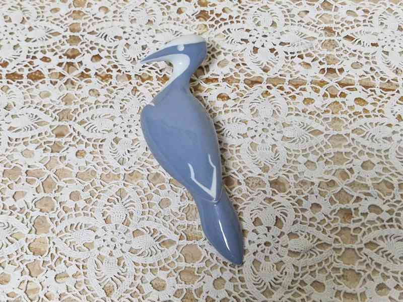 Vzácná porcelánová plastika, Datel, Expo 58, styl Brusel, vzácnější modro bílé provedení - Royal Dux, původní kus z počátku šedesátých let 20 stol.