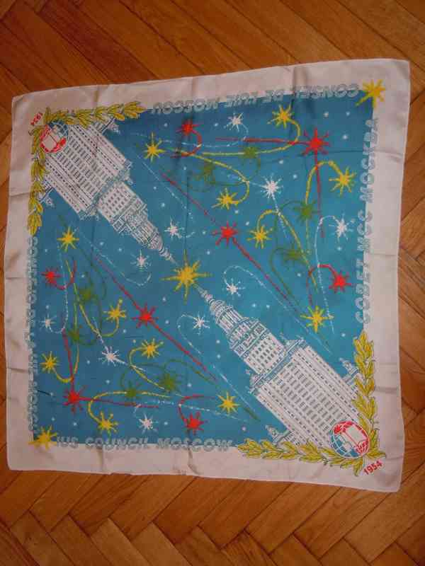 Prodám starší hedvábný šátek z jednání Mezinárodního svazu studentů v Moskvě v roce 1954. Rozměry: 78 x 78 cm. Perfektní stav. Sběratelský kousek. Osobní předání na Praze 3, nebo zaslání přes Zásilkovnu či Balíkovnu. Volejte 770 630 523, nebo pište na morgiana007@gmail.com