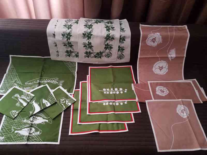 Prodám zcela nové, RETRO látkové prostírání. Dále je uveden typ, počet kusů, rozměry a cena za celek. 1. Zelené s rybou 1 + 4 (54 x 38 + 38 x 38), cena 270,- Kč. 2. České Vinařské Závody 4 kusy (46 x 31), cena 200,- Kč, 3. Zelené s větvičkou 4 kusy (37 x 37), cena 160,- Kč, 4. Hnědé s máky 1 + 4 (52 x 35 + 34 x 34), cena 240,- Kč. Osobní předání na Praze 3, nebo odeslání přes Zásilkovnu či Balíkovnu. Volejte 770 630 523, nebo pište na morgiana007@gmail.com