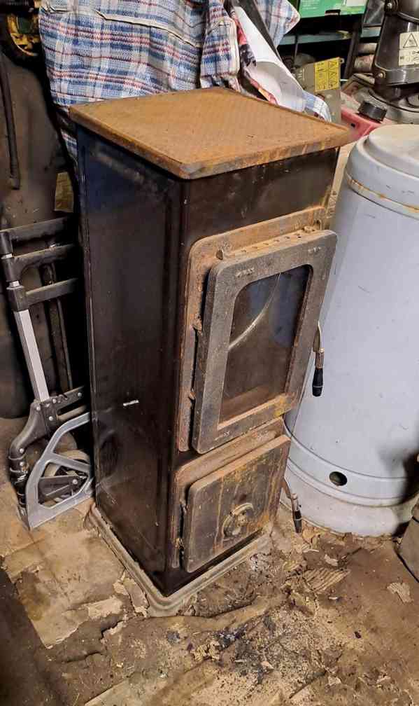 Částečně litinová, ocelový plech, vnitře obložený šamotem (prasknutý viz. foto.)