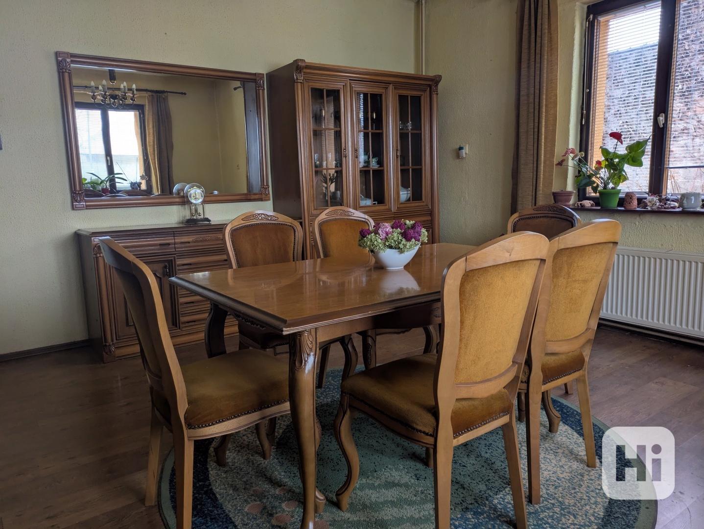 Prodám komplet jídelního stolu a 6 polstrovaných židlí. Velmi pěkný designový kousek - jednotné linie, krásné detaily. Pevný, bytelný nábytek, kombinace masivních prvků a kvalitních dýhovaných desek.