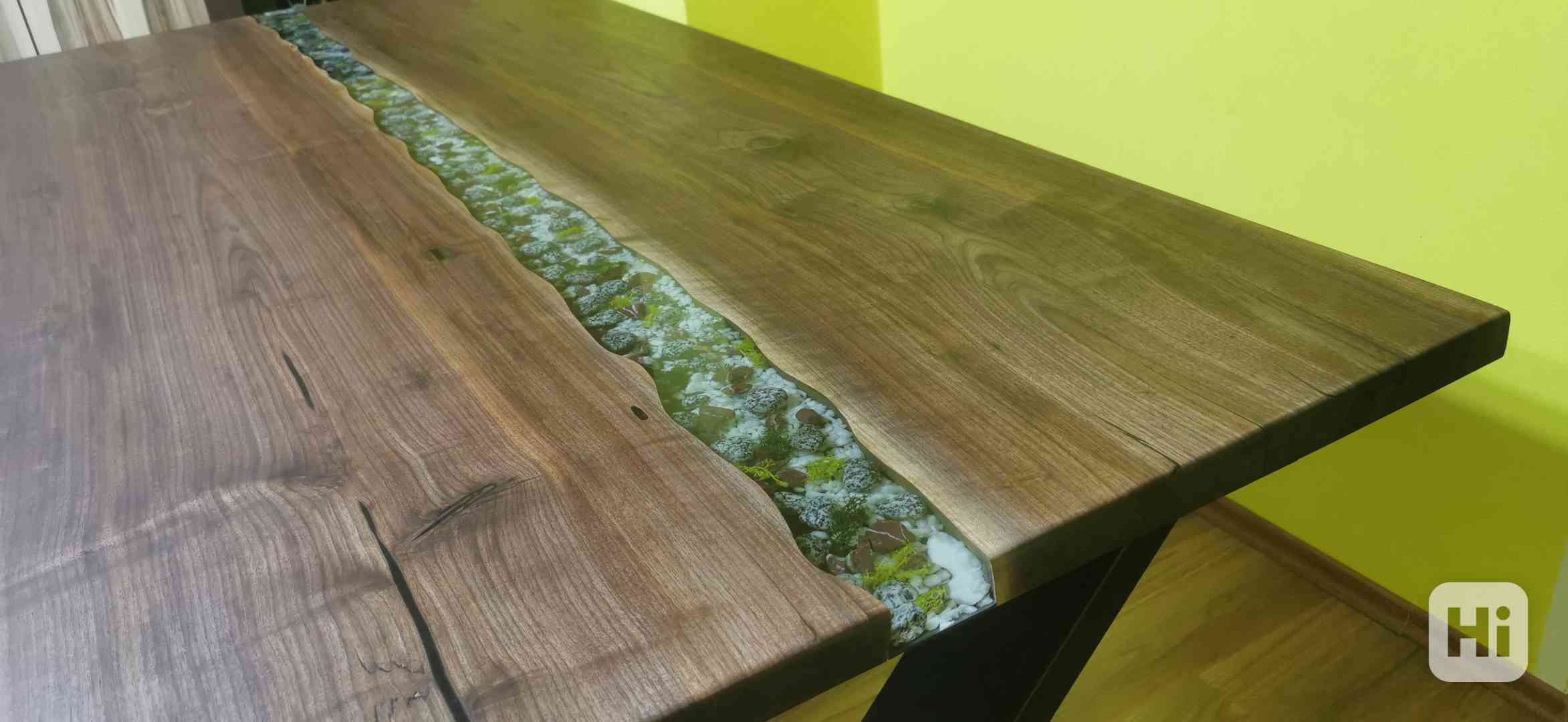 Nově vyrobený,stůl do jídelny nebo menší zasedačky z našeho stolařství o rozměrech 200x91cm,krásné dřevo amerického ořechu v kombinaci s pryskyřicí a kovovými podnožemi. Netradiční, moderní a originální stůl do vaší jídelny nebo kanceláře až pro 6 lidí.
