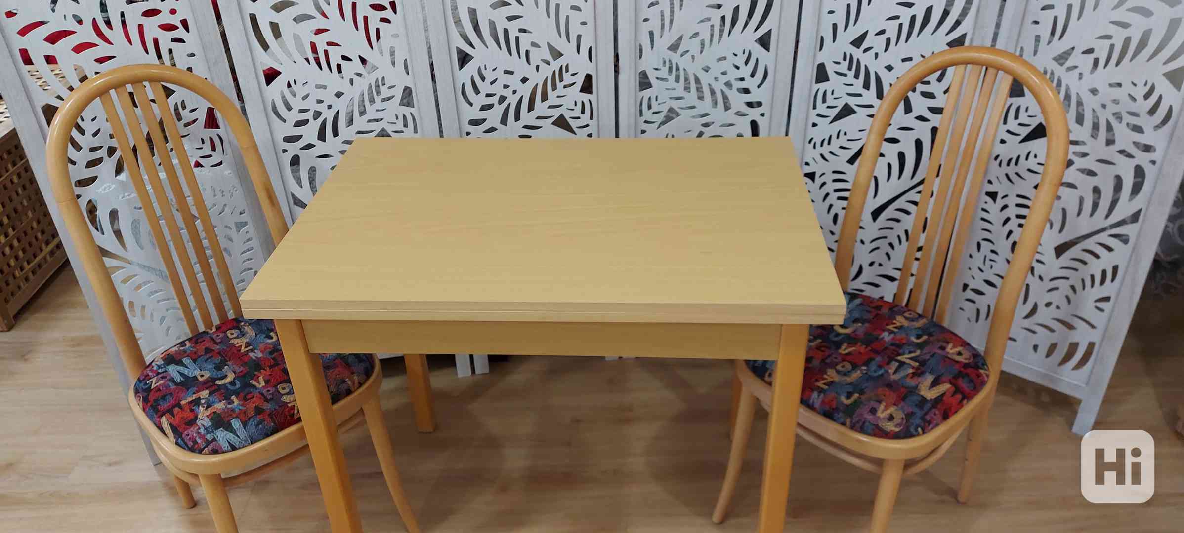 Velmi levně prodám bytelný rozkládací stůl se dvěma polstrovanými židlemi značky Ton.