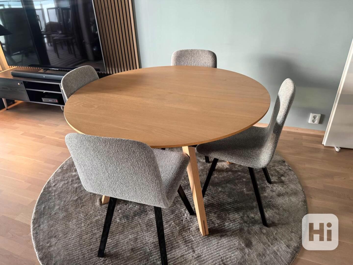 Masivní jídelní stůl z bíle pigmentovaného dubu. Čalouněné/světle šedé látkové židle, podnos Ilegg a kulatý koberec Bolia.