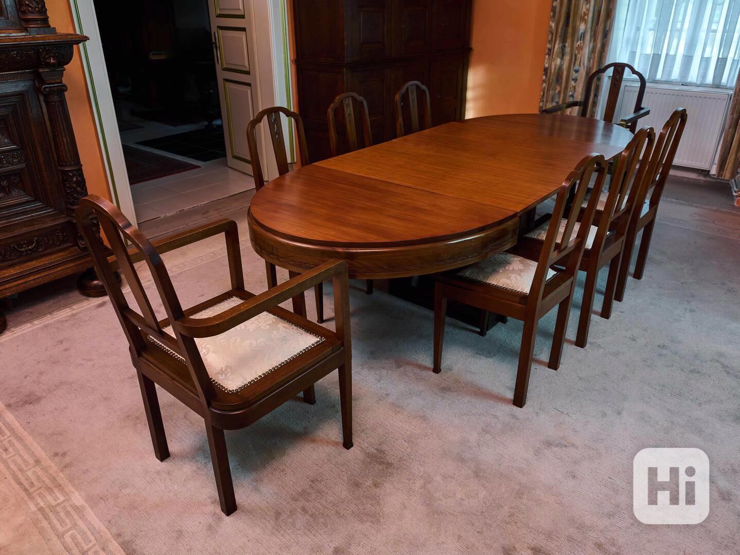 Reprezentativní jídelní souprava Art Deco, tvořená rozkládacím jídelním stolem, šesti jídelními židlemi a dvojicí křesel s područkami. Celek je zhotoven z masivního mahagonu s pečlivě vybranou kresbou dřeva a kvalitní povrchovou úpravou, odpovídající vysokým nárokům na nábytkovou produkci meziválečného období.