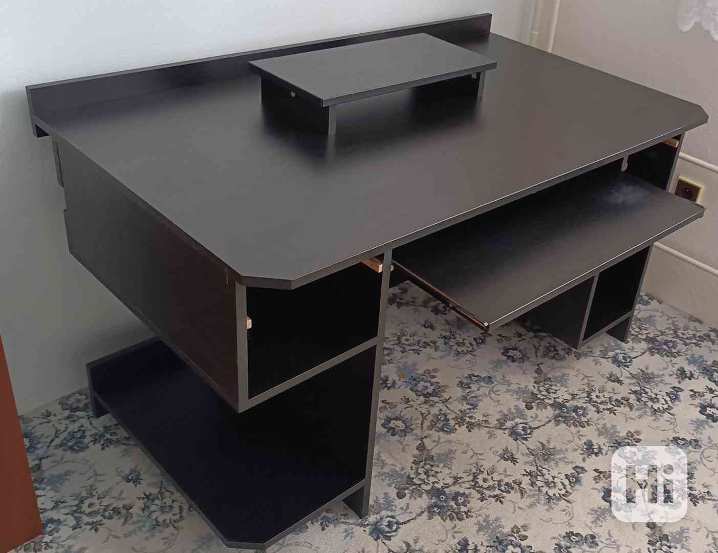 Z důvodu stěhování prodám atypický stůl pro PC a kancelářské práce: nadstandardní plocha 135 x 78 cm, výsuv pro klávesnici, prostor pro 2 šuplíky (ty nejsou součástí stolu, ale k dispozici jsou 2 přední černé desky), police pro tiskárnu, podstavec pro monitor.