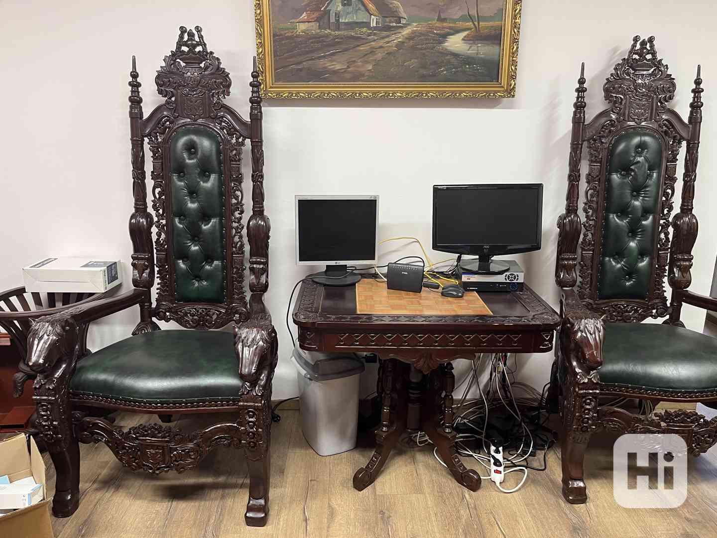 Prodam vybaveni- kancelarsky mahagonovy nabytek, mahagonovy sachovy stul + 2 zidle, mahagonovy krbovy ram, rozmery venkovni: 140cm x 120cm, vnitrni: 100cm x 100 cm. Cena 65000.--,