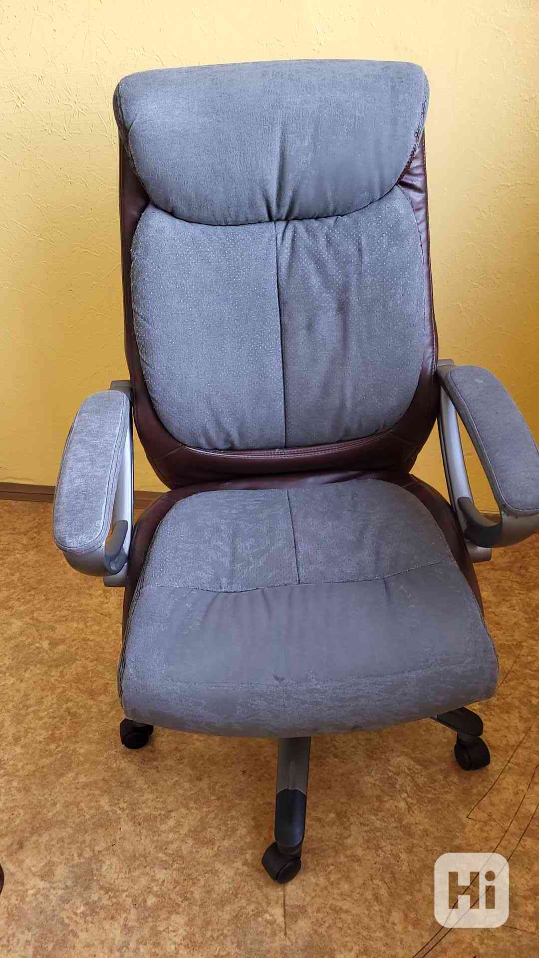 Prodám levně kancelářské křeslo s pohodlným měkkým polstrováním v oblasti sedáku, zádové opěrky i područek. Synchronní mechanika s nastavitelnou výškou sedu, univerzální kolečka. Křeslo je plně funkční, původní popraskaný koženkový povrch odstraněn a lze ho nahradit přiloženým snímatelným pracím potahem. Pouze osobní odběr s platbou v hotovosti v Praze 8-Čimicích.