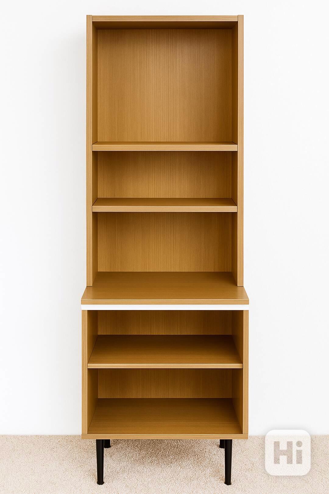 Nabízím vysokou knihovnu se čtyřmi policemi a spodní otevřenou částí s úložným prostorem. Vhodná na knihy, dekorace nebo dokumenty.