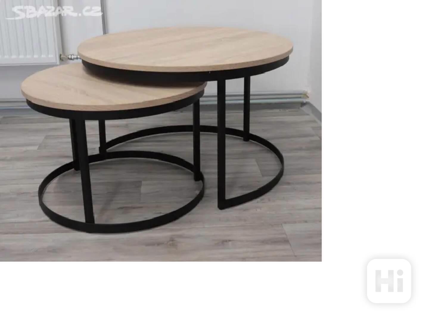 Konferenční stolek vyroben rám - práškově lakovaná ocel, šířka 2 × 2 cm. Stolová deska - lamino deska, tloušťka 18 mm. Rozměr konferenčního stolku pr. 75 /58 cm, výška 47 cm, menší stolek pr. 58/42 cm, výška 40 cm.