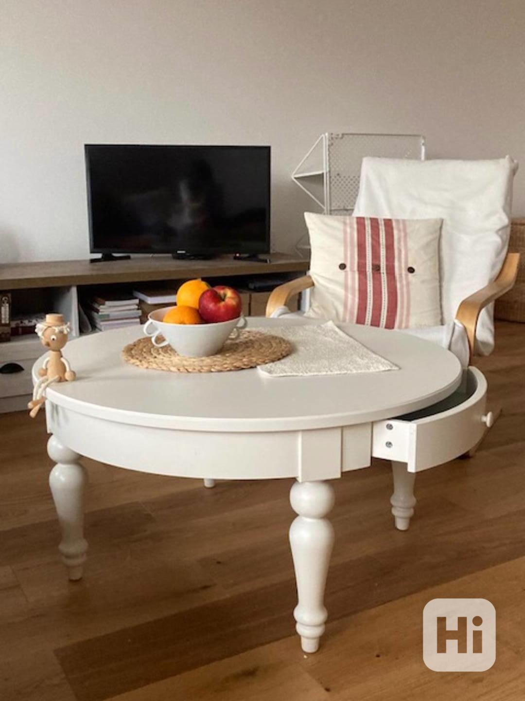 Nabízím bílý konferenční STOLEK s KRUHOVOU deskou (MDF). Nohy jsou vyrobeny ze dřeva. Má zásuvku.