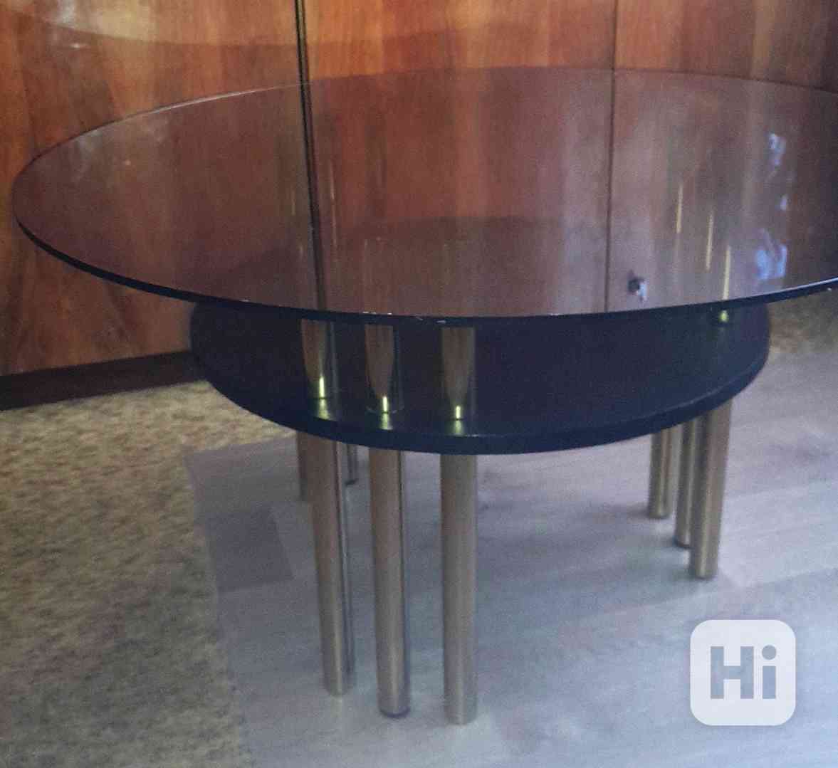 Nabízím konfereční stolek, kulatá, skleněná vrchní plocha, průměr 90cm, pod ní 20cm, dřevěná odkládací plocha, průměr 60cm, celková výška stolku 80cm, 3x3 kovové nožky, nepoškozený, cena 300 Kč.