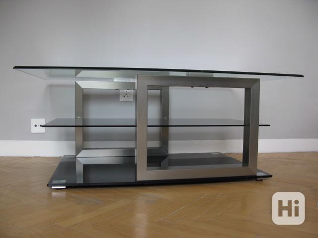 Pevná konstrukce, tvrzené sklo-police černá, horní deska čirá, rám hliník-barva šedá antracit bez prasklin a oděrků, plně funkční,