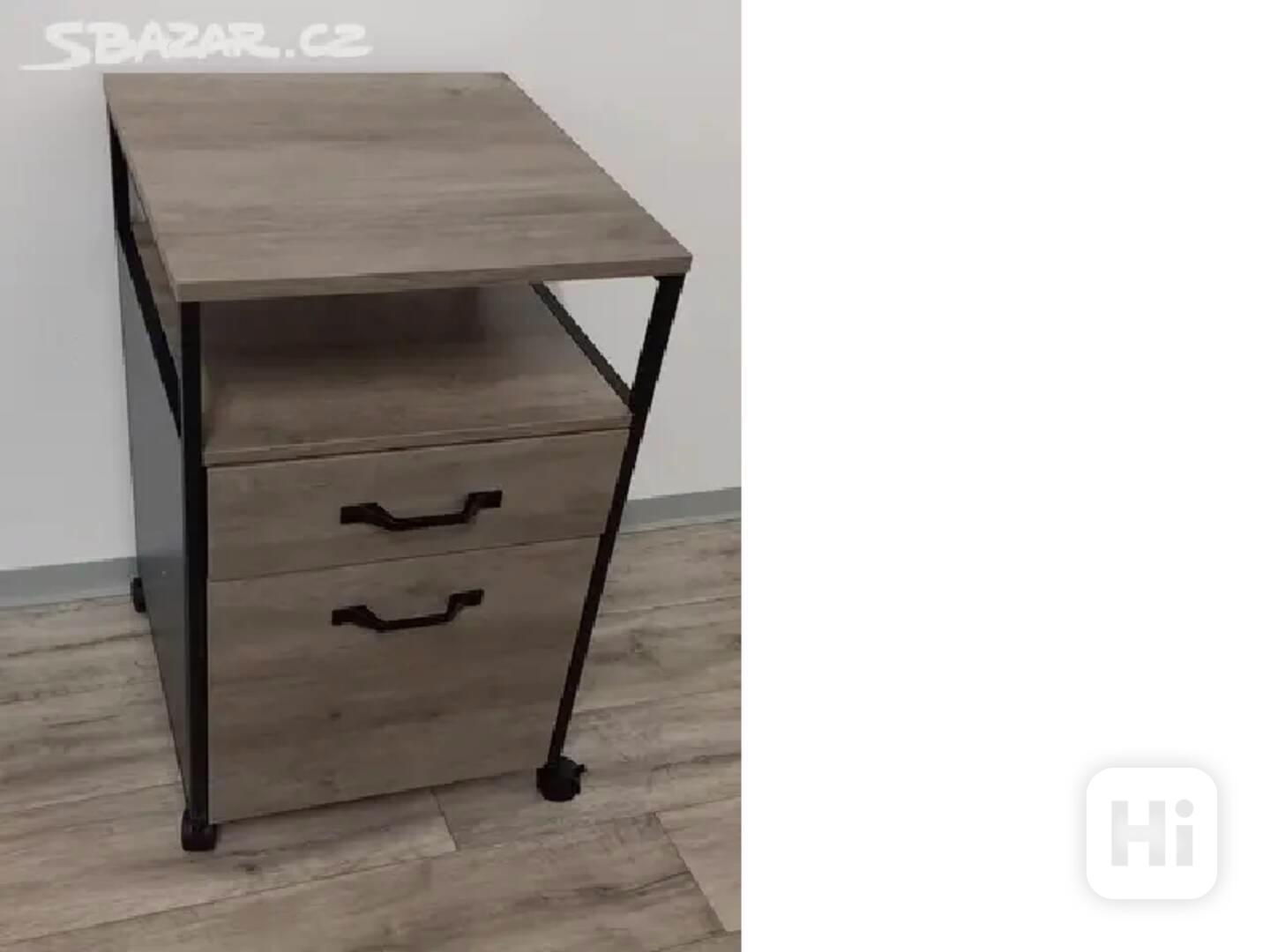 Kancelářská skříň na dokumenty s dvěma zásuvkami a kolečky, disponující otevřeným prostorem, vyrobená s ocelovým rámem v průmyslovém designu v kombinaci šedé a černé barvy. Rozměry tohoto produktu jsou 44 x 42 x 66,5 cm