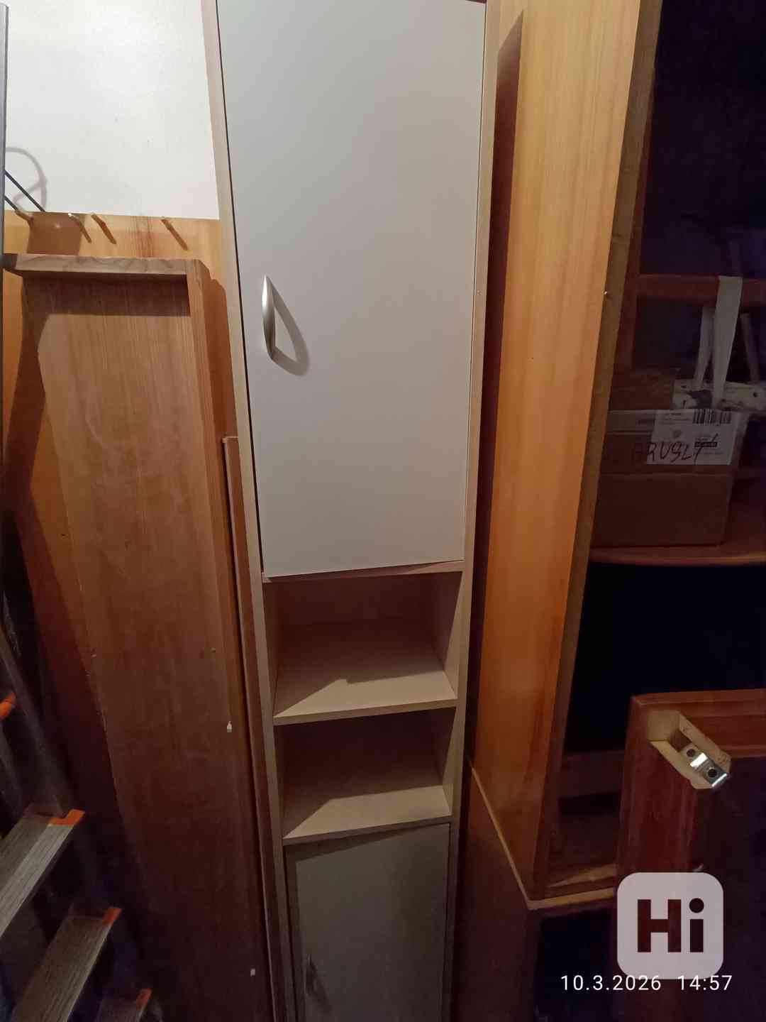 Boky skříňky a vnitřek ve světlé barvě imitace dřeva, dvířka v barvě slonovinové kosti. Krátce používaná. Nejen pro uložení koupelnových doplňků a předmětů, ale lze i do předsíně nebo kanceláře. Má 6 odkládacích policových přihrádek( část s možností změn výšky) dvoje dvířka s plastovou rukojetí hliníkového vzhledu. Rozměry (v x š x hl): cca.197 x 32,5 x 30 cm. MDF deska, vysoký tvar a úzké rozměry umožňují umístění i do užších prostor. Osobní odběr Plzeň.