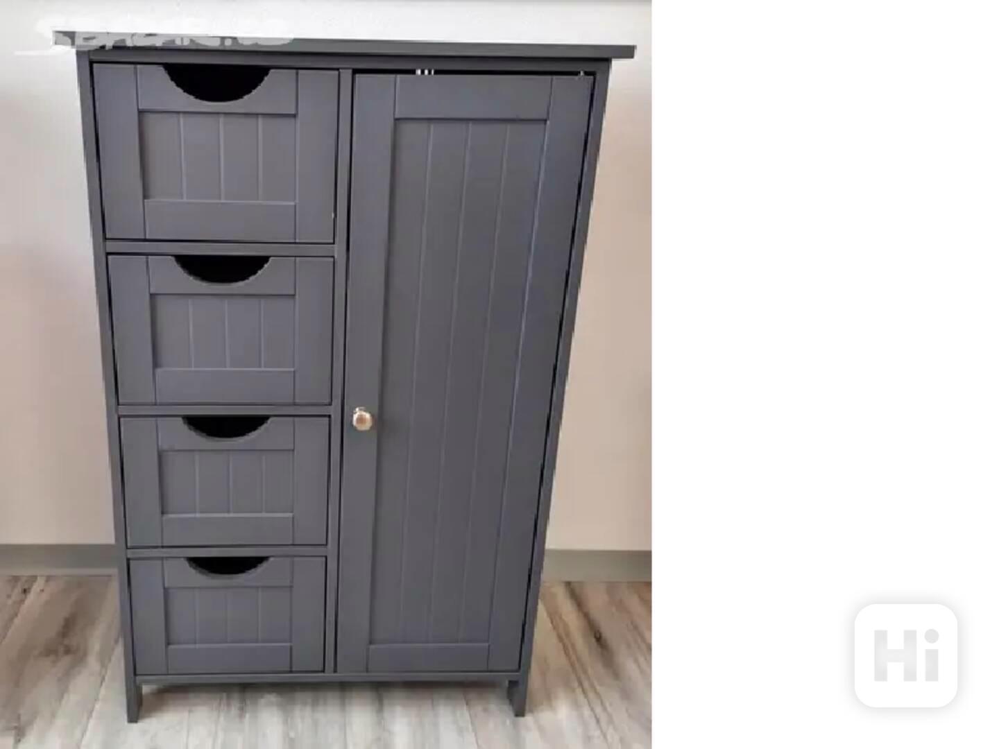 Praktická a stylová koupelnová skříňka v moderní šedé barvě. Nabízí 4 prostorné zásuvky a uzavíratelnou skříňku s poličkami pro uložení ručníků, kosmetiky a dalších potřeb.