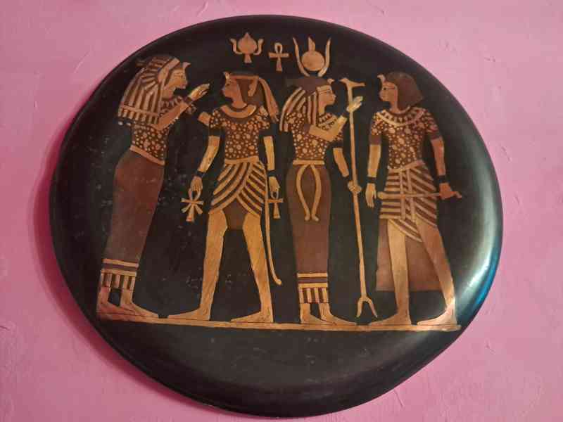 Prodám měděný nástěnný talíř s egyptskými motivy.