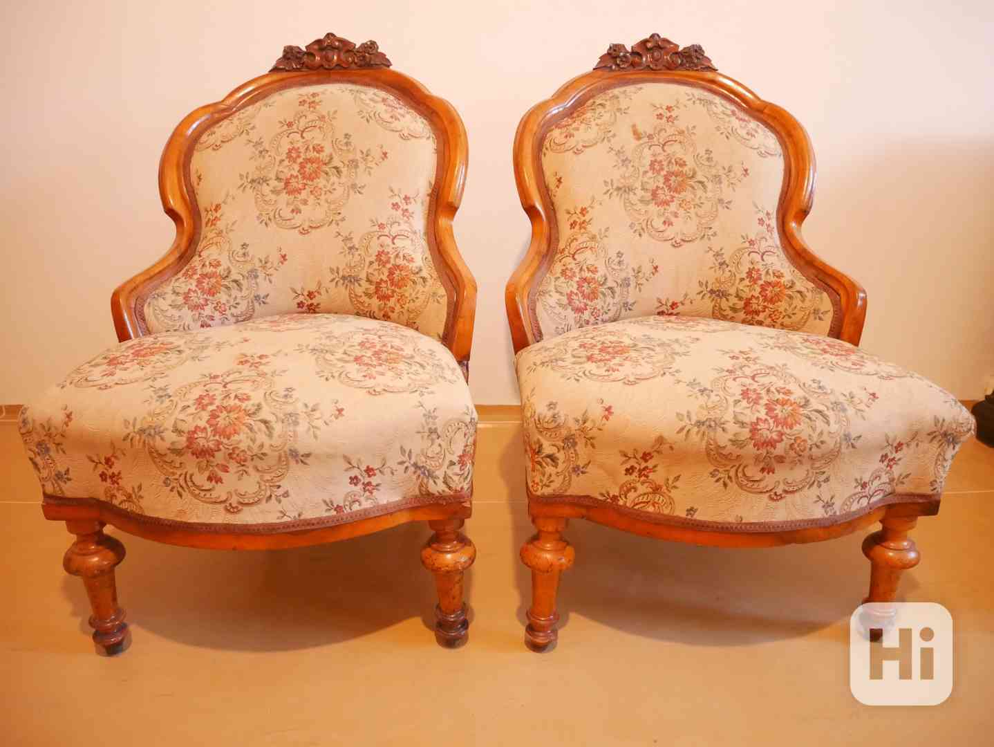 Půvabná secesní řezbovaná křesílka z masivu s květinami,2 ks - 12.7. - 17:46
