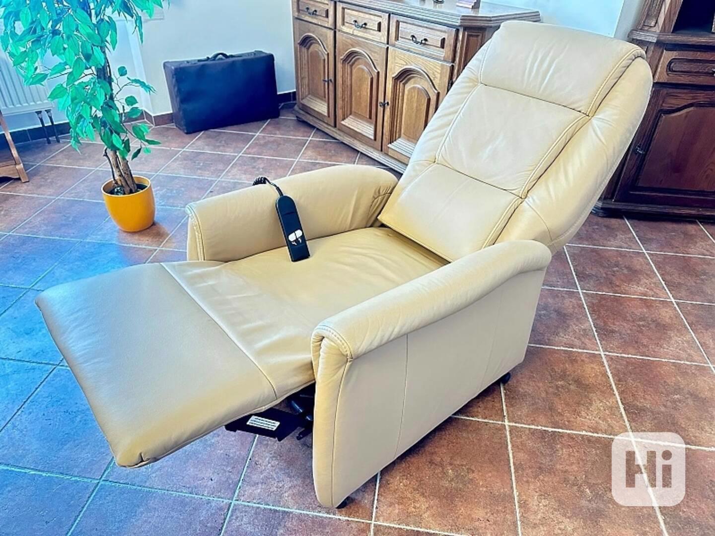 Křeslo má elektromotor s ovladačem k polohování sezení, vysunutí podnožníku a výklop k postavení sedícího - ideální pro člověka se sníženou schopností pohybu. Hloubka 78 cm. Šířka 68 cm. Výška 105 cm.