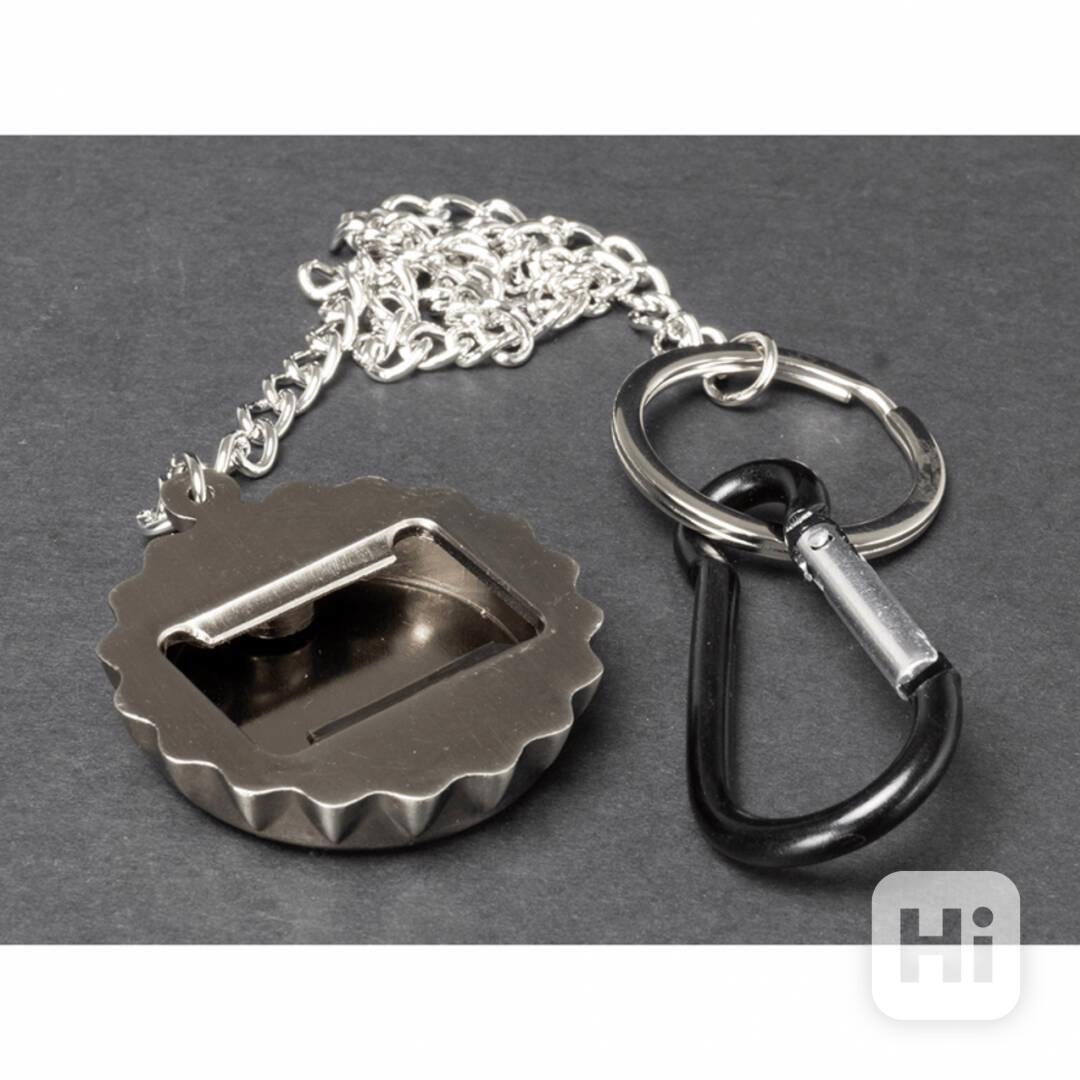 Kovový otvírák ve tvaru zátky od piva. Se symbolem Českého lva.