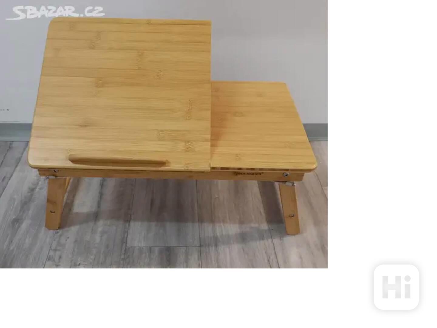 Multifunkční skládací stolek vhodný jako podložka pod notebook, servírovací stolek na snídani do postele nebo odkládací stolek. Vyroben z přírodního bambusu, odolný a lehký. Jedna část pracovní plochy je nastavitelná, ideální pro práci, čtení i relax.