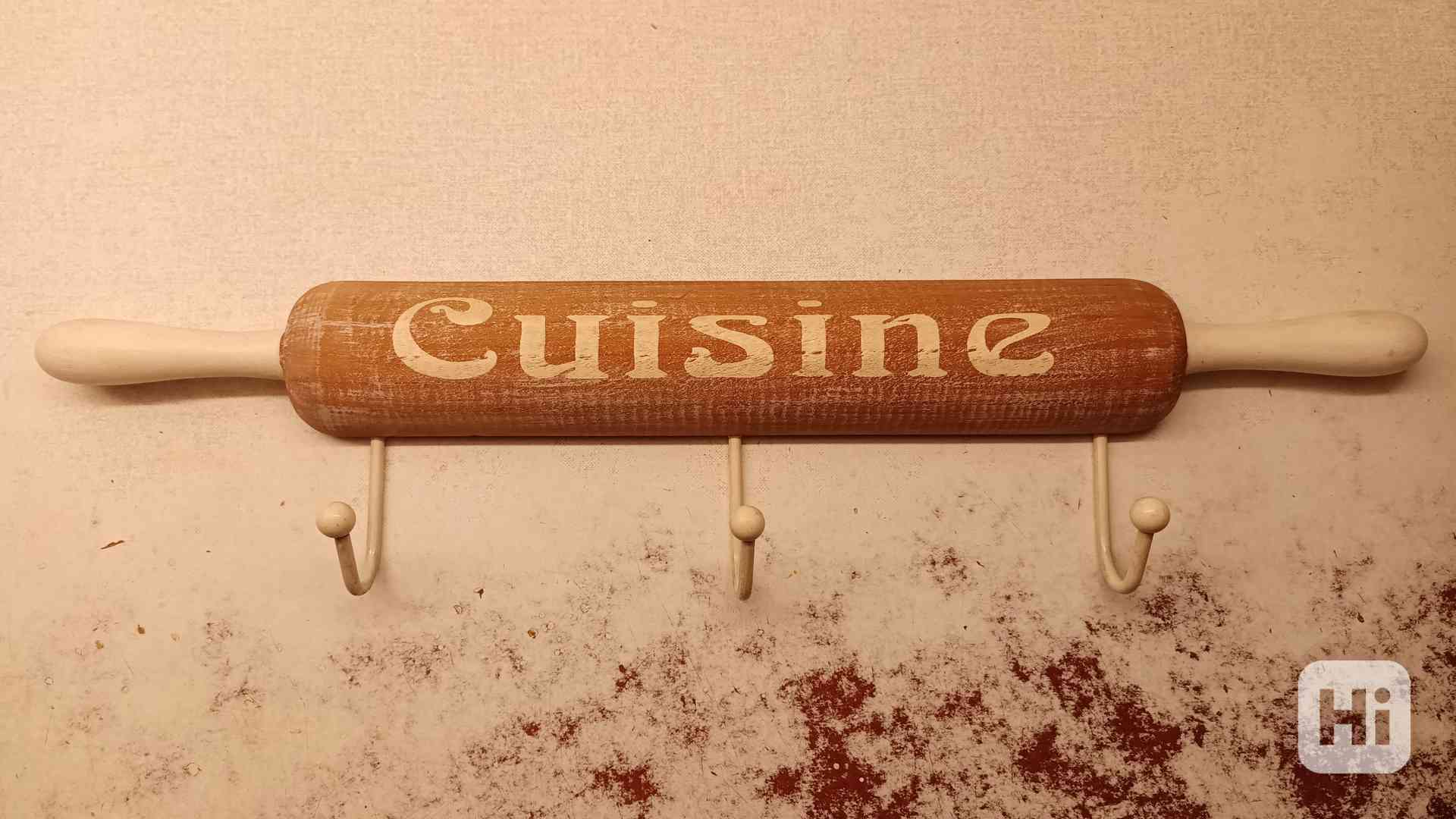 Prodám zachovalý věšák kombinace dřevo/kov s nápisem "kuchyně". K pověšení na zeď na hřebíčky. Celkové rozměry 50x12x5cm.
