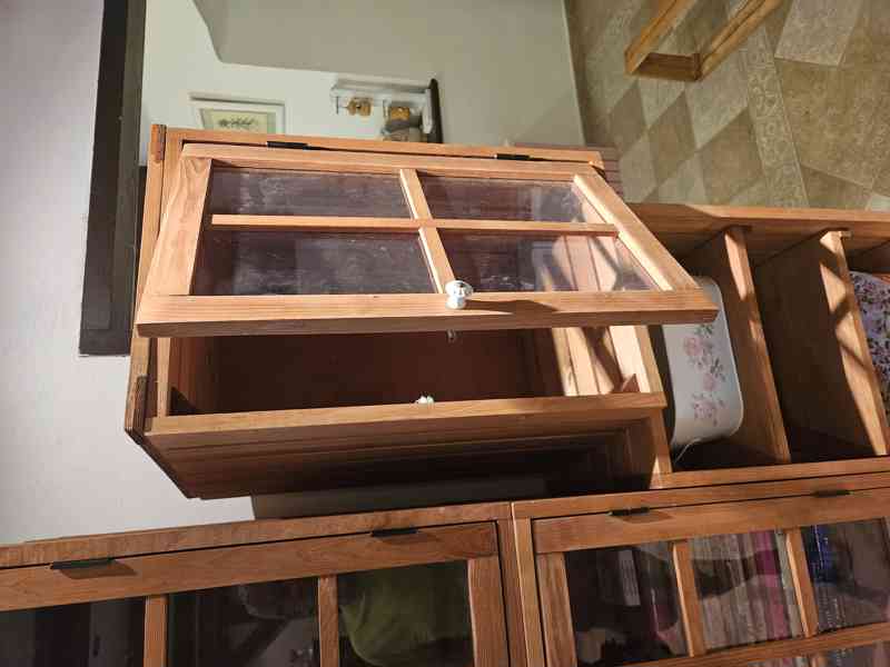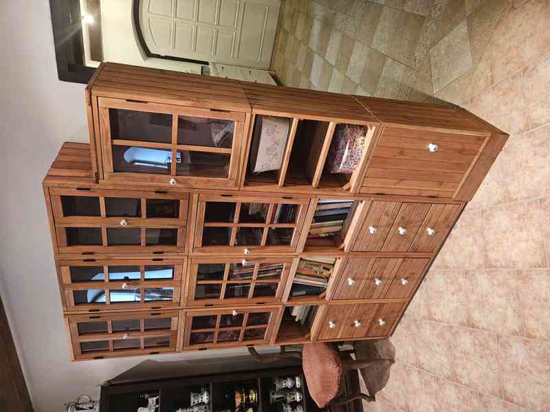 NOVÁ - Dřevěná modulová stavebnice, doprodej z naší výrobní AKCE : "SESTAVTE SI SVŮJ ANTIK". Jednotlivé skříňky o velikosti 57x38x38cm s různým designem ve starém stylu. Výborně se uplatní také např. v podkroví, kde jsou šikmé stěny. Na fotkách jsou pro lepší představu sestavené v jedné z mnoha možných variant. Dají se také sestavit např. díly se šuplíky zvlášť jako KOMODA, a pak zase třeba samostatně díly s prosklením, jako VIRÍNA... atd... Cena je za celý zbytek stavebnice. Prodej pouze v celku (viz. foto). Rozměry sestavy na fotce jsou délka152 x hloubka40 x výška201cm.