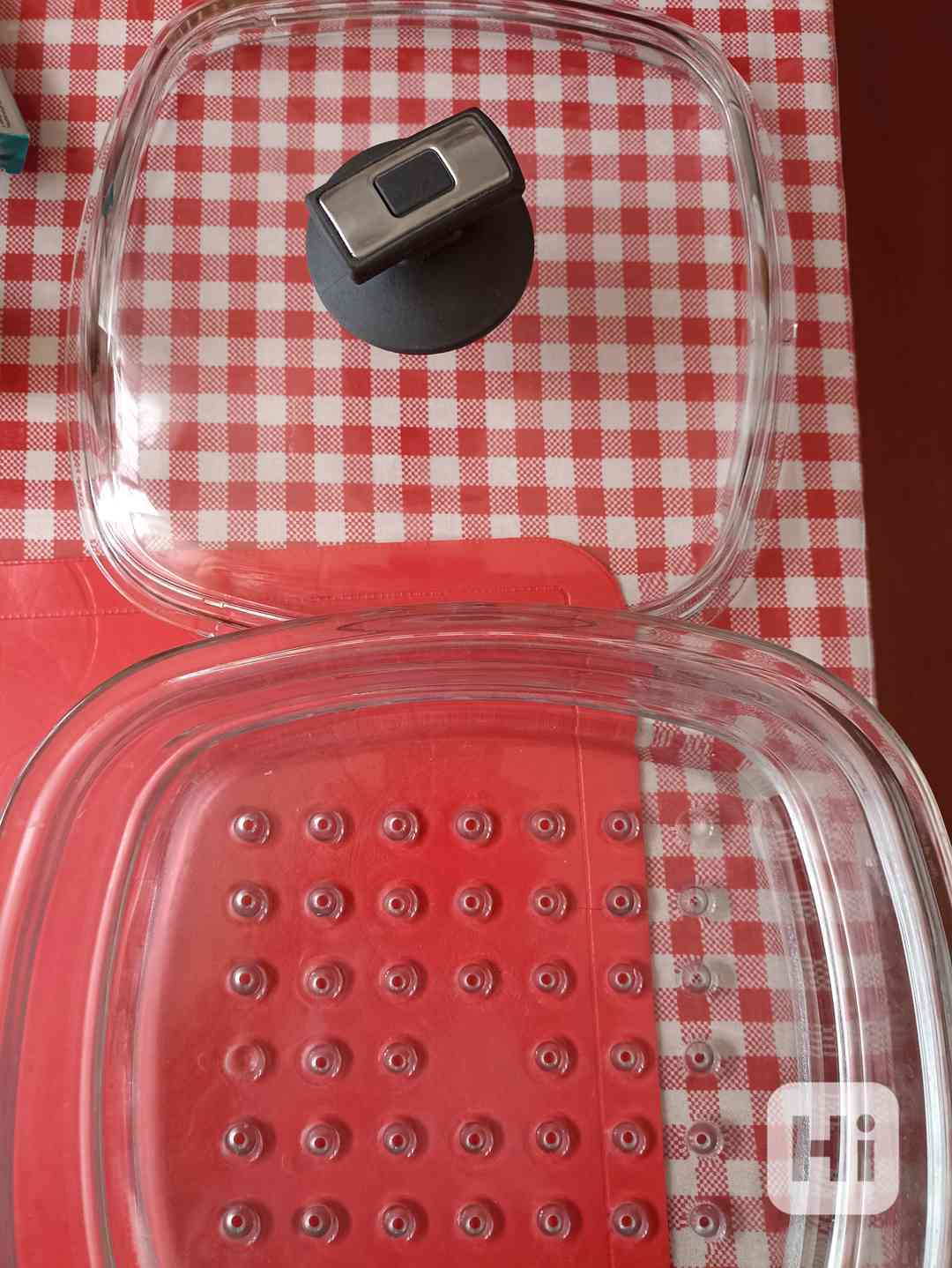 Prodám novou pyrexovou poklici na kastrol /pekáč/ vel. 26x26cm a pařák 26x26cm. Možnost vaření v páře bez tuků. Zelenina si zachová barvu a chuť. Pyrexová poklice má spec. drážky, neuniká pára ani voda. Jídlo je uvařené podstatně rychleji. V případě zájmu možno i jednotlivě. Původní cena poklice 350,- a pařák původní 700,-.
