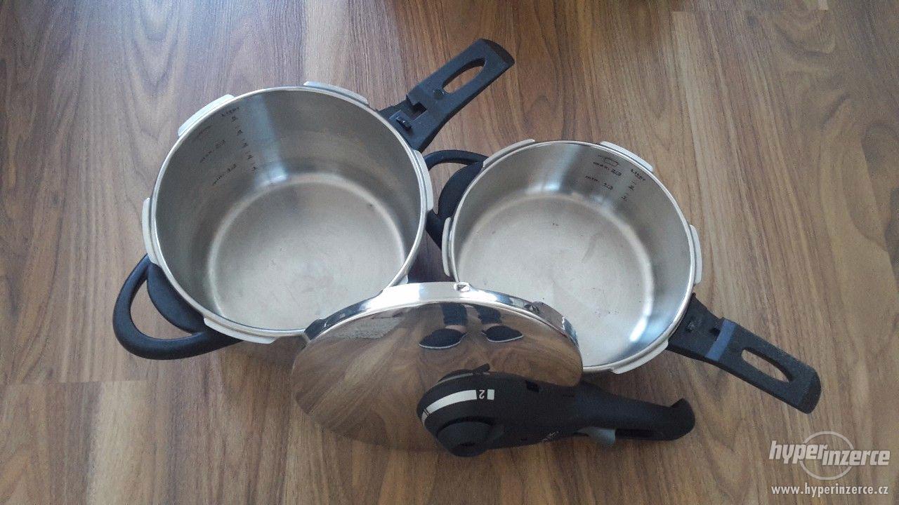 Nabízím 2ks tlakových hrnců 3 a 5l, jsou v top stavu, nepoužité. Set vypadá tak jak je zobrazeno na fotkách.