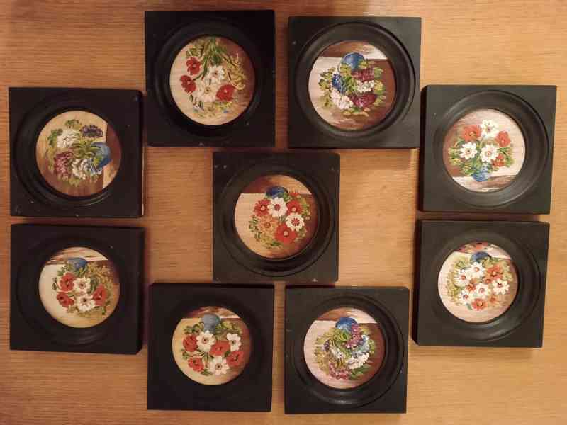 Prodám 9 ks ručně malovaných obrázků květin – každý originál, rozměry 14,5 x 14,5 cm. Cena za kus – při odběru všech.