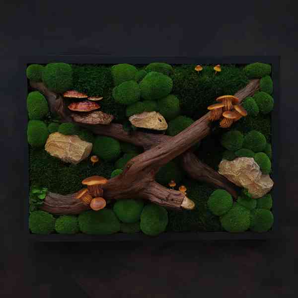 Obrazy jsou ručně vyrobené ze stabilizovaného mechu, rostlin a sušených hub tzn, že jsou bezúdržbové.